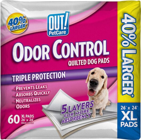 OUT! Odor Control Quilted Extra Large Dog Pads (60 ct) are 40% larger* (compared to OUT! standard sized dog pads) and provides triple protection against dog messes to absorb wetness quickly, neutralize odors, and prevent leaks. Odor Control XL Dog Pads (26 in x 24 in) have a 5-Layer construction for more absorbency and unique Odor Control Technology, making them great for dogs with working parents, dogs with incontinence, lining crates and carriers, cleaning wet paws or fur, and car travel. Leak-proof backing on dog pad helps to prevent leaks.